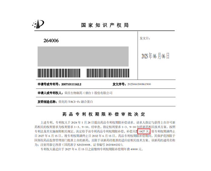 2025年6月、中国国家知識産権局(CNIPA)はRemeGenの主力薬である注射用「テリリタセプト(Telitacicept/商品名:泰愛)」のコア特許(ZL200710111162.2)に対し、1827日(約5年)の特許期間補償を認め、既存の有効期限(2027年6月15日)を2032年6月15日まで延長する決定を下した。これは新専利法施行後、医薬品業界としては第1号の最大補償期間の獲得、いわゆる「トップ伸び」が認められた事例である。
