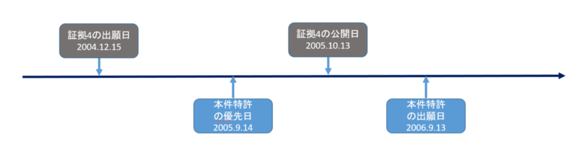 証拠4は本件特許の特許権者が出願した先行出願WO2005/095381A1で、出願日が2004年12月15日であり、公開日が2005年10月13日である。証拠4と本件特許との時間関係は下図の通りである。
